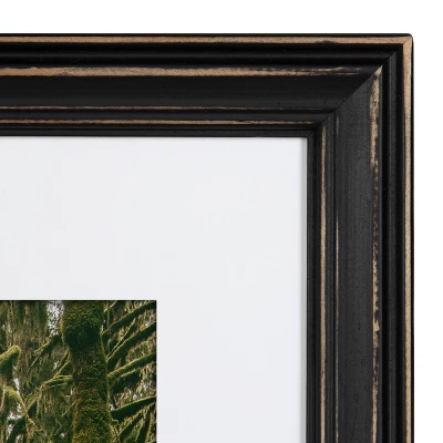 Bring all your memories together with this one-stop frame and shelf kit for your home! Our Bordeaux gallery wall frame and shelf kit includes seven frames of various sizes and three shelves to display your favorite pieces of home decor. This set of frames feature a distressed satin black finish inspired by farmhouse aesthetics. The three shelves included in this set also feature the black finish to complement the traditional appeal of this collection. Two of the three shelves in this collection are 12 inches wide by 1 inch high by 4 inches deep, while the third smallest shelf is 6 inches wide by 1 inch high by 4 inches deep. Photo frame sizes: (1) 11×14 matted, photo display size 8×10; (2) 8×10 matted, one photo display size 5×7 and the other containing two displays for 4×6 photos; (1) 7×9 frame matted, photo display size 5×7; (2) 5×7 frames unmatted, and (1) 4×6 frame unmatted.