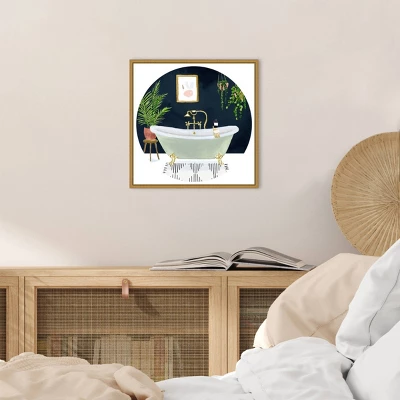 ART DESCRIPTION: This stylish print portrays an old-fashioned bathtub as the centerpiece of a bathroom vignette. The claw-foot tub has brass fixtures, and beside and above it is a variety of houseplants that add color and life to the image. This Amanti Art canvas art print was created by Victoria Borges and printed by Amanti Art in Madison WI. The canvas is stretched by hand and finished with a float frame. Individually made using traditional custom framing techniques, it has the quality you would expect from your local frame shop. Because of our attention to detail and focus on artistry, architects, interior designers, and homeowners alike choose this framed canvas artwork to create beautiful living spaces.