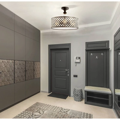 Add drama and sparkle to your ceiling with our modern, semi-flush light fixture. Faceted crystals are set into a chic black metal drum shade, and a diffuser softens the light at the bottom. This light fixture is a glamorous addition to your hallway, bedroom or bathroom. This 12.5 tall light fixture is large enough to fit ceilings 8 to 10 feet high. Surrounded by sparkling crystal, this fixture’s three bulbs give soft light. As this fixture must be hardwired, we recommend a professional electrician manage installation. Eco-friendly 4W LED bulb included. Takes three bulbs and compatible with any 9W LED or 40W TYPE A or 13W CFL. UL Listed. Before cleaning any lamp shade or fixture, disconnect the power source. Wipe with a soft, dry cloth. Avoid the use of chemicals and household cleaners as they may damage the finish.