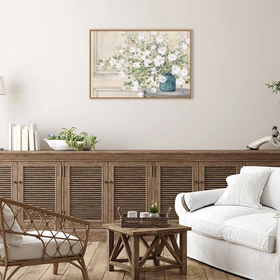 ART DESCRIPTION: Delicate blossoms spill out of the vase on this table, creating a spray of beautiful white botanical shapes and a feeling of peace. The pretty blue vase showcases the lovely stems arranged with care in this painting. This Amanti Art canvas art print was created by Julia Purinton and printed by Amanti Art in Madison WI. The canvas is stretched by hand and finished with a float frame. Individually made using traditional custom framing techniques, it has the quality you would expect from your local frame shop. Because of our attention to detail and focus on artistry, architects, interior designers, and homeowners alike choose this framed canvas artwork to create beautiful living spaces.