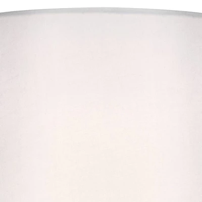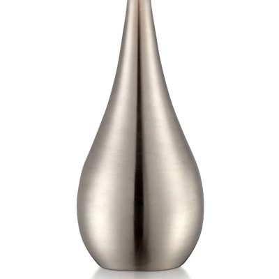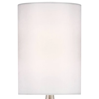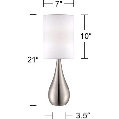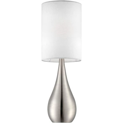 This brushed nickel table lamp set is the perfect light for a transitional or modern style living room or bedroom. A sleek teardrop base is topped with a white cylinder shade that completes this contemporary look. A 360 Lighting design.