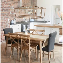 Take your dining ensemble from simple to stylish with this must-have chandelier pendant, inspired by vintage streetlamps. It showcases an open, geometric frame that is supported by two chains and features six candle-style bulbs. Try hanging it over your dining room table, or suspend it above the kitchen island. An open lantern-style design gives this chandelier an air of hospitality. Adjustable chain link makes this fixture suitable for most ceiling heights. Eco-friendly 4W LED bulb included. As this fixture must be hardwired, we recommend a professional electrician manage installation. Takes 6 bulbs and compatible with 9W LED or 40W Type B or 13W CFL. Color Temperature: 2700K. CRI: 80. Before cleaning any lamp shade or fixture, disconnect the power source. Wipe with a soft, dry cloth. Avoid the use of chemicals and household cleaners as they may damage the finish.