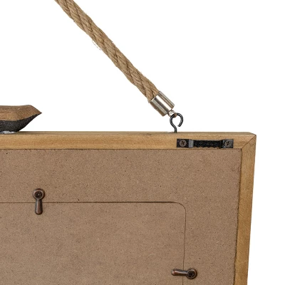 Personalize any room in your home or office with this hanging multi-photo frame exclusively from Foreside Home and Garden. A natural wood border adds warmth to the inset gray galvanized background, while a small bird figurine and jute rope hanger adorns the top. This puzzle-style collage frame adds a personal touch to any space and provides a way to showcase four of your favorite 4×6 photos.