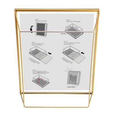 Elegantly display your favorite memories with Stonebriar’s 8×10 metal floating photo frame with wire stand. This modern picture frame is made of sturdy metal and features a shiny brass finish. Frame comes with a metal wire stand for vertical or horizontal display on any table top or shelf. Easily load your photos between the 2 glass panes to create a floating effect. Protective glass also keeps your pictures safe from dust and damage. Stonebriar’s frame can be displayed by itself, or look for other decorative frames from the Stonebriar Collection and create your own decorative set.