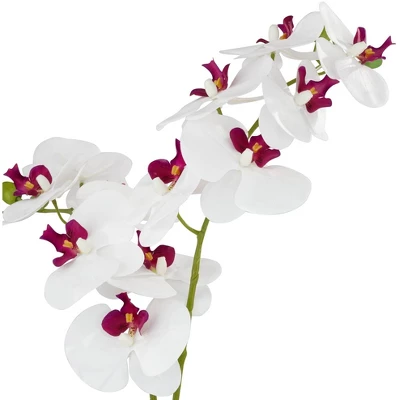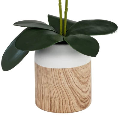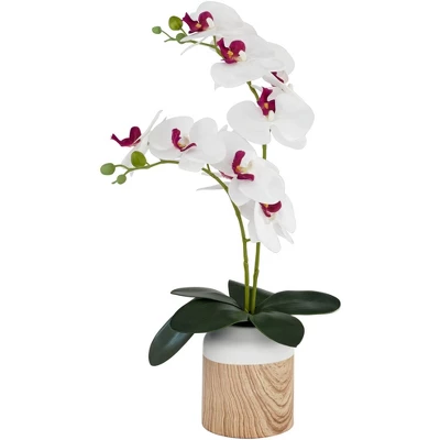 Enjoy the beauty of a bouquet that lasts with this elegant, purple and white faux flower arrangement. This elegant faux orchid arrangement instantly cheers up a room with its realistic design and bright, colorful hues. The plastic and wire faux flowers are arranged in a white and wood finish ceramic pot to complete this authentic design.