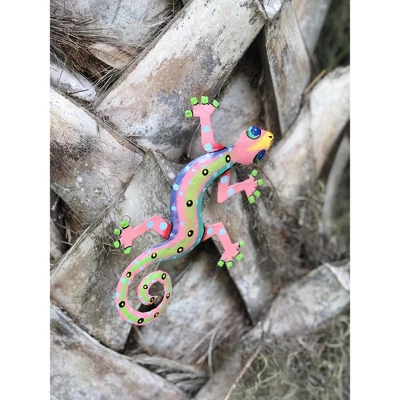 This gecko is handmade in Haiti from recycled oil drums. Each has a small tab to hang the piece and is painted with a bright colorful design inspired by the local Haitian culture. From head to tail, the gecko is 13 inches long. Measures approximately 8-inches wide. Tab on the back for hanging. Display indoors or outdoors. Made of recycled steel and if they are exposed to the elements, they will eventually rust over time. To keep your artwork looking new, respray once a year with a clear enamel if hanging outdoors. The Story Behind the Art: Crafted from recycled 55-gallon steel drums by village artisans in Haiti, these stunning piece of coastal-inspired artwork is truly one-of-a-kind! The process of turning sheets of metal into beautiful art is all done by hand. Steel drums used to transport oil into the capital of Haiti are cut, the oil is burned off to clean the metal, and then flattened in order to create stunning, upcycled art.