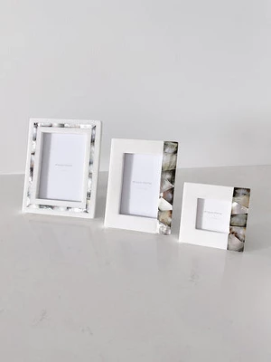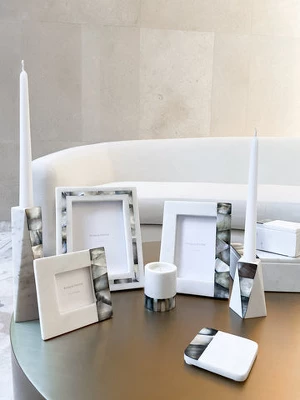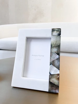 The Grey Mother of Pearl White Marble Picture Frame features the Genuine Mother of Pearl stripe accent with a natural iridescent White and Golden color tone. When light hits each piece, the iridescent colors shine bright against the White Marble background creating a luxurious, natural experience. Each piece is hand made; white gift box included.