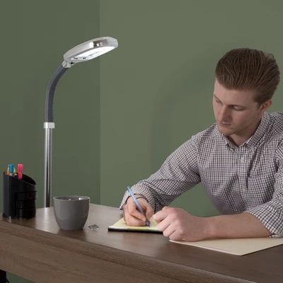 Bring stylish and modern lighting to your home, office, or workspace with the Floor Lamp by Hastings Home. This attractive reading lamp has a contemporary chrome finish with a matching cord for versatile placement. With a 1300 lumens 27W CFL bulb and 6500K color temperature, this dimmable standing lamp projects natural light, helping to alleviate eye strain. The sunlight lamp features a gooseneck arm that provides flexible height adjustment and unlimited angle choices, making it easy to focus the light exactly where you need it.