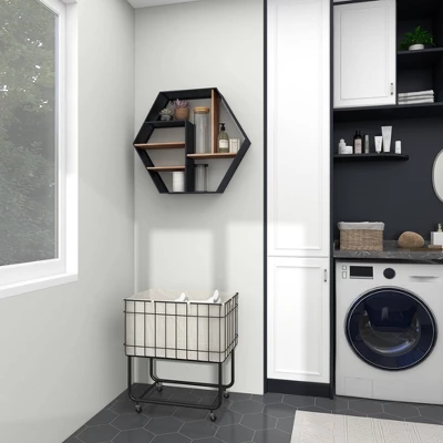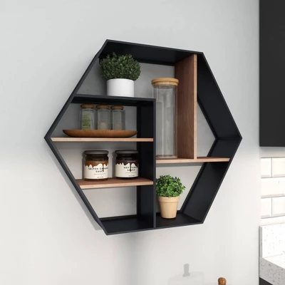 Organize and decorate in style with this black and brown hexagon wall shelf that would easily complement your industrial-themed home space. This item ships in 1 carton. Can be hung horizontally using the keyholes on the back; nails and screws not included. Suitable for indoor use only. This item ships fully assembled in one piece. Maximum weight limit is 20 lbs. This is a single black colored floating shelf. Fir wall shelf features 5 shelves. Industrial style.