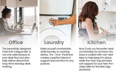 - NO SLIP: An ideal Anti- Fatigue should not only look pleasant but it should also keep the floor completely dry and prevent us from slipping. Our Nonskid backing holds the mat in place for extra safety.
