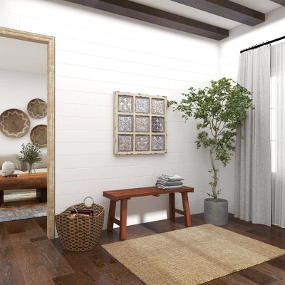 This metal and wood wall plaque can significantly improve your rustic style space when mounted on walls. This item ships in 1 carton. The frame color is a creamy light beige with distressed markings revealing raw wood beneath it Soft brown brush strokes bring out the shadows in the iron plaques. Can be hung vertically using the D-rings on the back; nails and screws not included. Suitable for indoor use only. This item ships fully assembled in one piece. This is a single white colored wall sculptures. Rustic style.