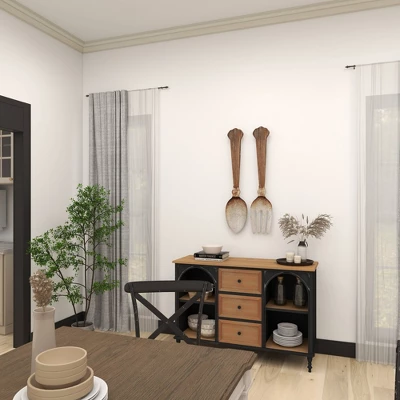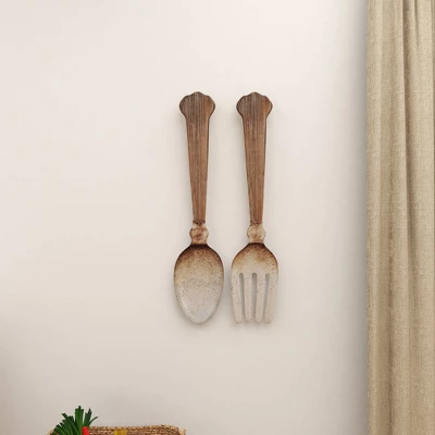 These utensil decors will look excellent in any farmhouse style inspired dining rooms or kitchens. This item ships in 1 carton. Extra large metal and wood flatware wall decor pieces. Iron wall decor makes a great gift for any occasion. Can be hung vertically using the keyholes on the back; nails and screws not included. Suitable for indoor use only. This item ships fully assembled in one piece. This brown colored wall sculptures comes as a set of 2. Farmhouse style.