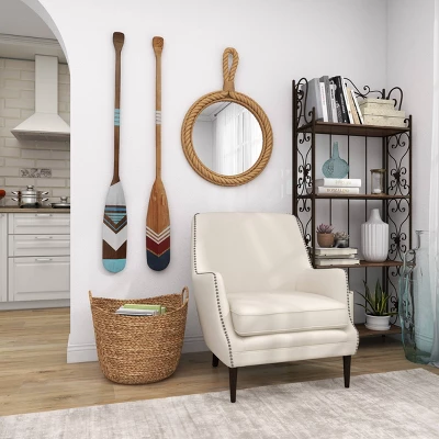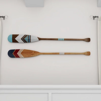 - This oar wall decor features two brown wood pieces with blue, white, and red paint accents
