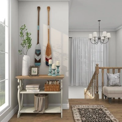 Use this nautical oar wall decor set as a two-piece leaning-against-the-wall floor standee, or as separate corner ornaments. This item ships in 1 carton. Wood wall decor makes a great gift for any occasion. Can be hung horizontally or vertically using a hanging hooks; hook, nails and screws not included. Suitable for indoor use only. This item ships fully assembled in one piece. This multi colored wall sculptures comes as a set of 2. Coastal style.