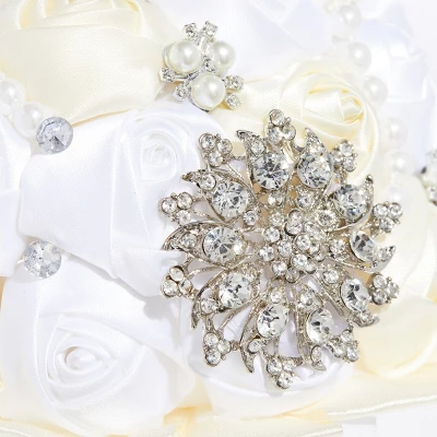 - Elegant, Rhinestone Brooch: The quinceanera bouquet is adorned with white and ivory roses, pearls, and rhinestone brooches; the handle is wrapped in cotton lace with a sparkling brooch in the center
