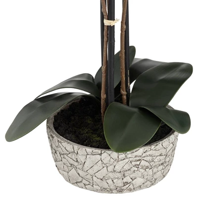 - Three stems of faux red orchids in a crackle gray vase. A beautiful accent for a living room table or shelf.