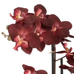 This beautiful flower arrangement with black round riser comes with three stems of super realistic faux red orchids. This design comes in a beautiful gray crackle finish vase.