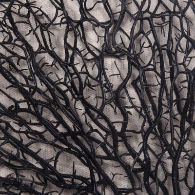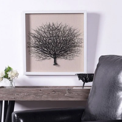 The creamy linen fabric backing adds contrasting color and texture. Black ties are used to secure the plastic tree design to the backing for a seamless look. This piece exemplifies superior product design and great styling. It will pair well with transitional styling. If you put it in the bedroom or family room, this decor stands out. Suitable for residential use in a dry location. Due to the way this piece is made, no two are exactly alike and color finishes may vary from piece to piece. Due to lighting and monitor differences, actual colors and finishes may vary slightly from what appears online